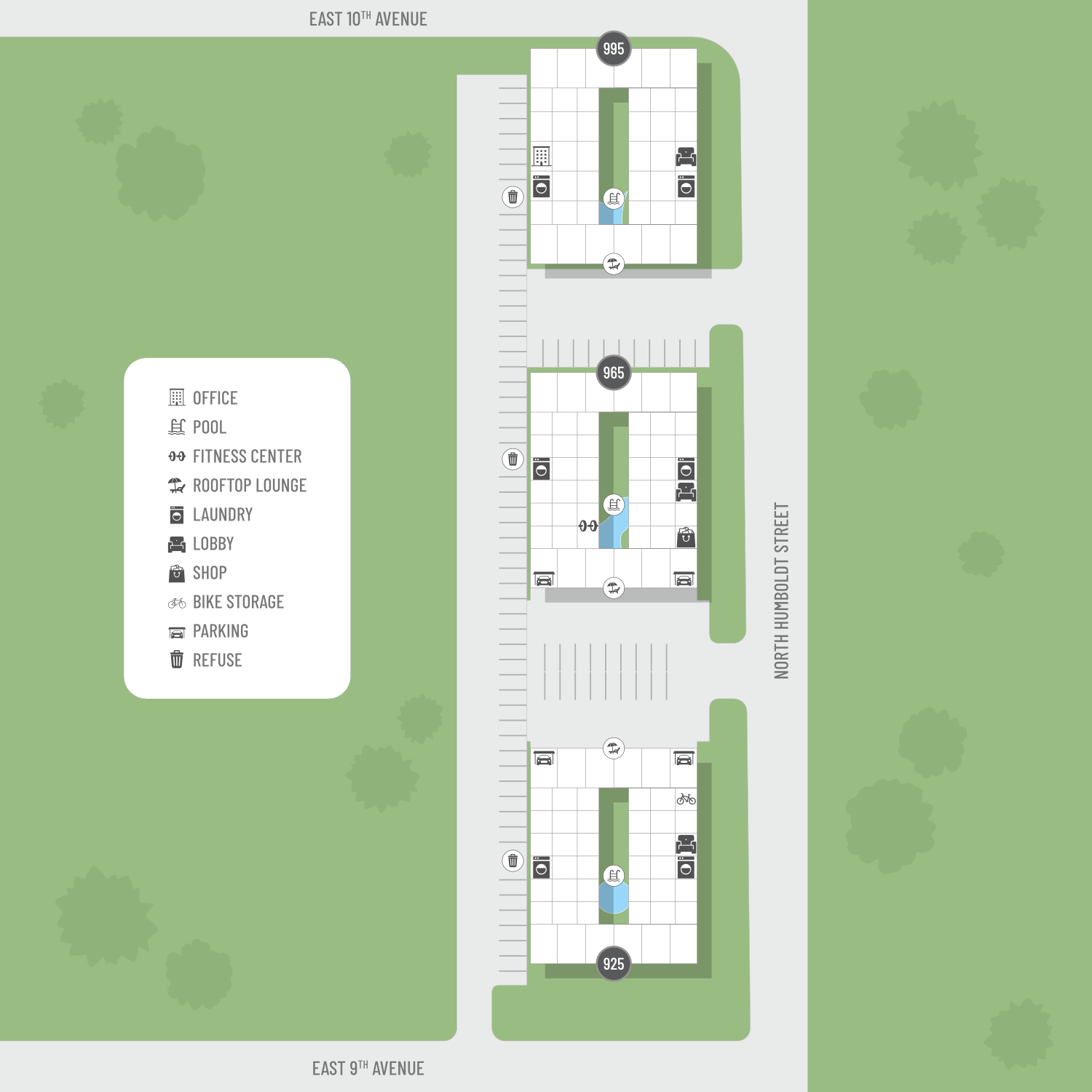 Select a floor plan or bedroom count to view those units on the overhead view on the site map. If you need assistance finding a unit in a specific location please call us at 303-837-9551 TTY: 711.